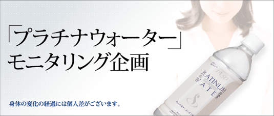 余分な活性酸素を除去するのが「酵素」ですが、30才位から減少をはじめ、 35〜40才にはほとんどなくなってしまいます。 この度、主要な4大活性酸素を除去する「白金ナノコロイド」を配合した ミネラルウォーター『プラチナウォーター』の公開モニタリングを実施させて頂きました。 今回の企画は、みなさまに3週間継続して一日一本飲んで頂きました。 プラチナウォーターは「一日一本」継続して飲んで頂く事により、より健康を実感頂けるミネラルウォーターです。